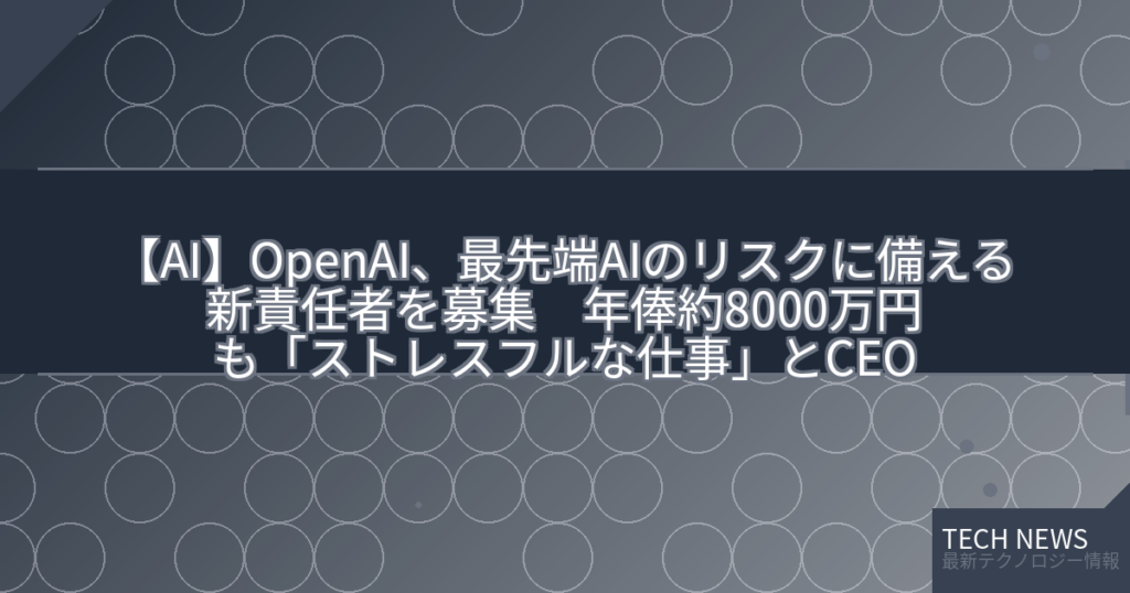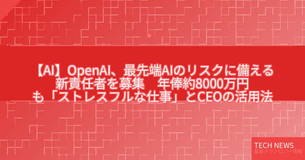 【AI】OpenAI、最先端AIのリスクに備える新責任者を募集 年俸約8000万円も「ストレスフルな仕事」とCEOの活用法