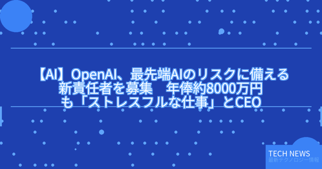 【AI】OpenAI、最先端AIのリスクに備える新責任者を募集 年俸約8000万円も「ストレスフルな仕事」とCEO