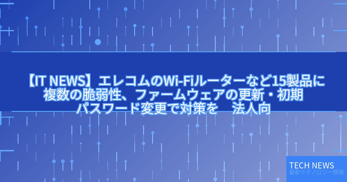 ・元記事タイトル:エレコムのWi-Fiルーターなど15製品に複数の脆弱性、ファームウェアの更新・初期パスワード変更で対策を 法人向けAP「WAB-S733IW-PD」「WAB-S300IW-PD」は使用を停止し買い替えを