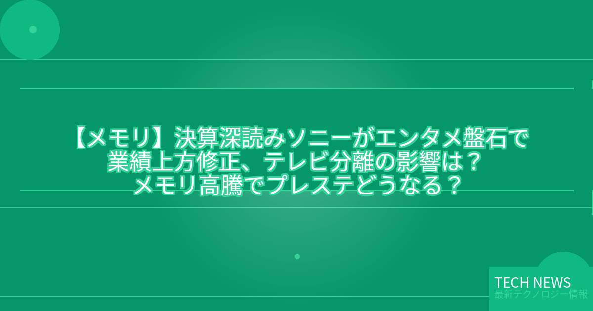 記事タイトル:【決算深読み】ソニーがエンタメ盤石で業績上方修正、テレビ分離の影響は? メモリ高騰でプレステどうなる?