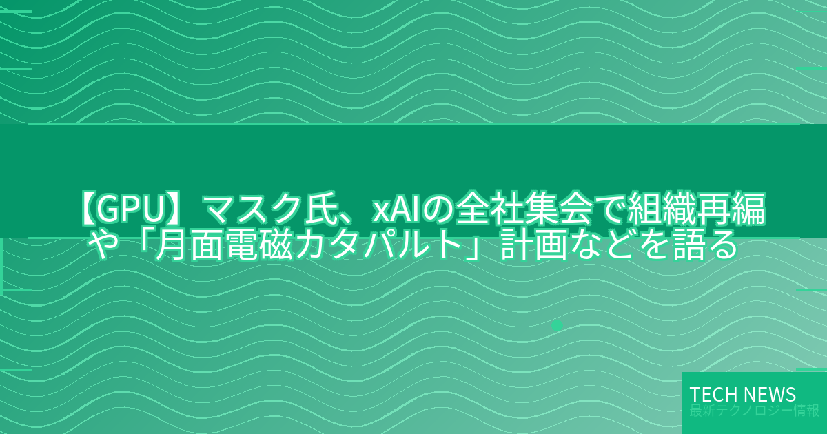 記事タイトル:マスク氏、xAIの全社集会で組織再編や「月面電磁カタパルト」計画などを語る