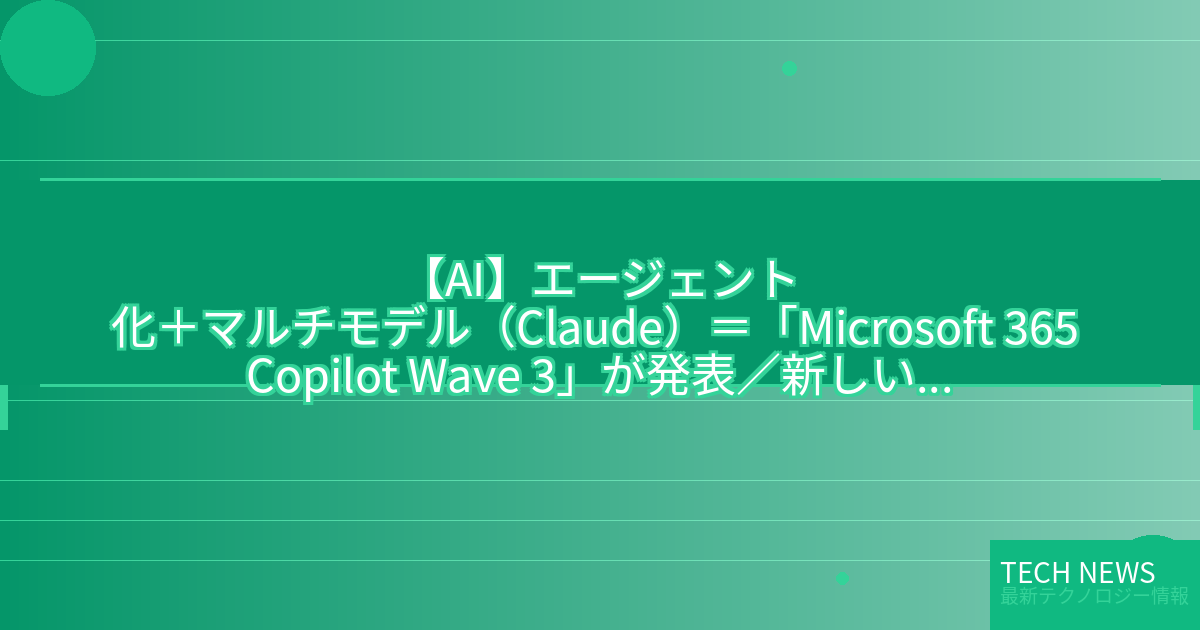 記事タイトル:エージェント化+マルチモデル(Claude)=「Microsoft 365 Copilot Wave 3」が発表/新しいプラン「Microsoft 365 E7」も提供へ
