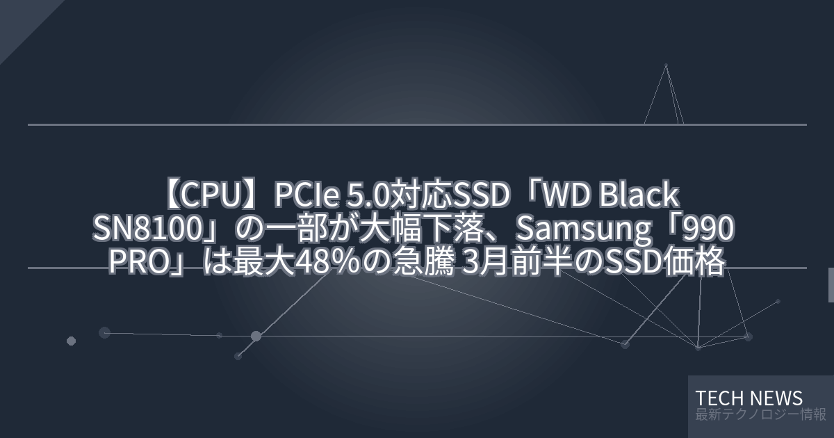 記事タイトル:PCIe 5.0対応SSD「WD Black SN8100」の一部が大幅下落、Samsung「990 PRO」は最大48%の急騰 [3月前半のSSD価格]