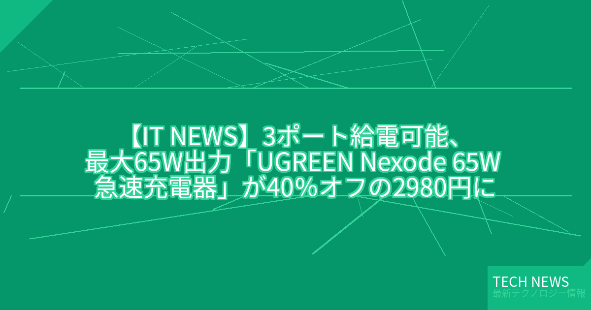 ・元記事タイトル:3ポート給電可能、最大65W出力「UGREEN Nexode 65W 急速充電器」が40%オフの2980円に