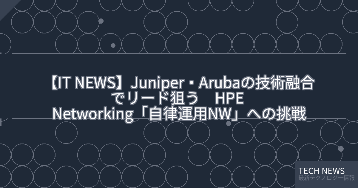 このニュースは、Hewlett Packard Enterprise(HPE)が買収したJuniper Networksとその自社ネットワーク事業部門のHPE Arubaの技術融合を通じて、「セルフドライビングネットワーク」の実現を目指す取り組みについて報告したものです。セルフドライビングネットワークとは、ネットワーク機器の自動構成、運用、管理を可能にする次世代のネットワーク技術概念です。