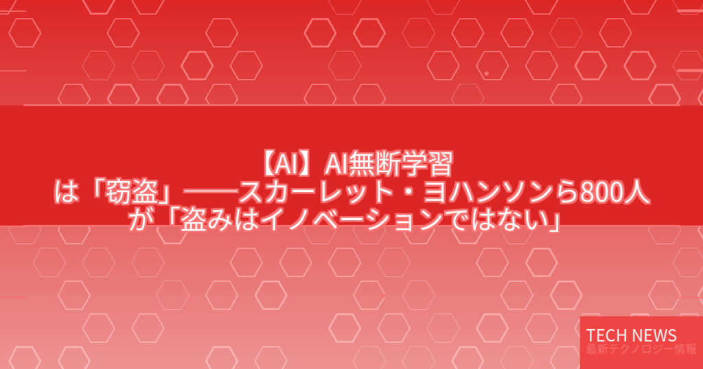 スカーレット・ヨハンソンら800人以上のクリエイターが、AI企業による著作物の無断学習を非難するキャンペーン「Stealing Isn’t Innovation」を開始した。「盗みはイノベーションではない」と断じ、著作権無視の現状を「窃盗」と定義。NYタイムズへの全面広告掲載など強力な抗議を展開して... -