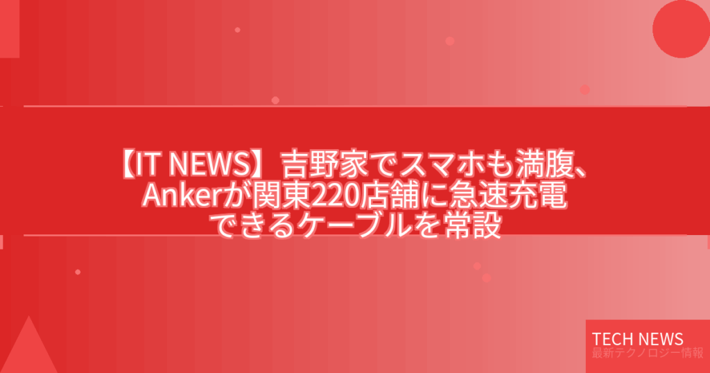 アンカー・ジャパンは10月10日、牛丼チェーン「吉野家」の関東エリア約220店舗の全客席に、同社製の充電ケーブルを順次設置すると発表した。食事中にスマートフォンを急速充電できる環境を提供し、顧客の利便性向上を図る。 -