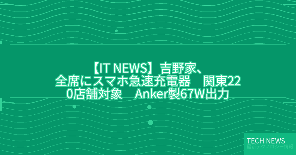 【IT NEWS】吉野家、全席にスマホ急速充電器 関東220店舗対象 Anker製67W出力