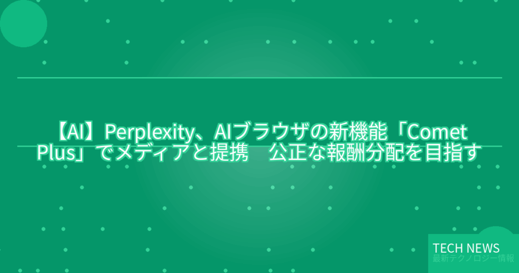 PerplexityはAIブラウザ「Comet」の新サービス「Comet Plus」を発表した。AIからCNNなどの提携メディアの記事に直接アクセスできる。参加パブリッシャーへの公正な報酬分配を目指す。無料プランユーザーは月額5ドルで、有料プランユーザーは無料で利用できる。