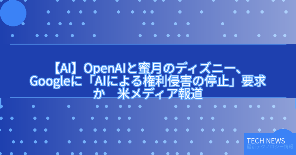 米Disneyは米Googleに対し、AIによる著作権侵害の停止を要求したと、エンターテインメント分野の専門誌「Variety」が報じた。 -