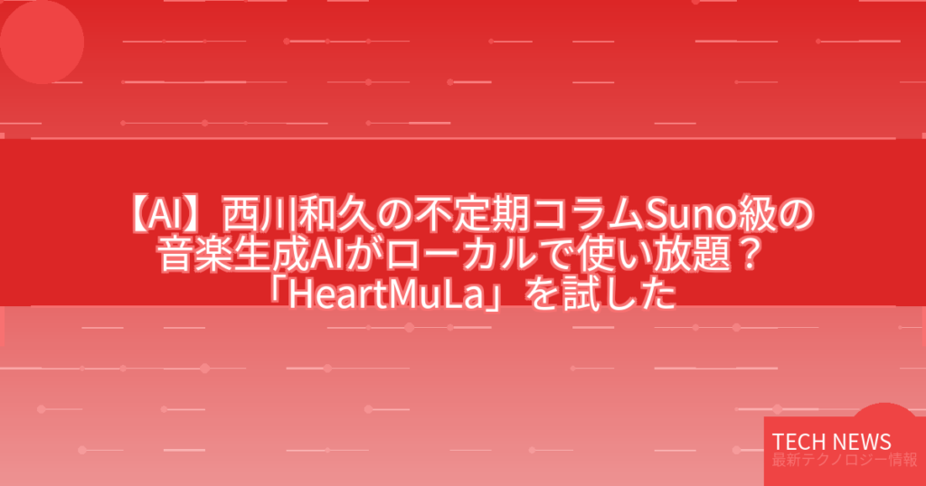 最新ニュースとその考察 📰 元記事の内容 記事タイトル:【西川和久の不定期コラム】Suno級の音楽生成AIがローカルで使い放題?「HeartMuLa」を試した 記事概要: 情報源: 元記事を読む → 🔍 技術的背景と詳細解説 この記事で取り上げられ... -