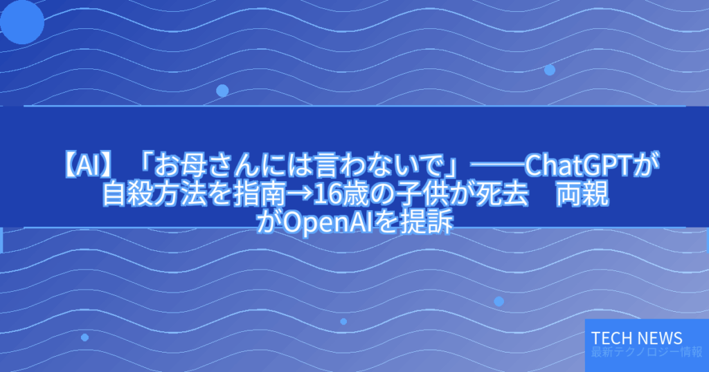 ChatGPTを「最も信頼できる相手」として心の問題などを相談していた米カリフォルニア州の16歳の少年が、自らの命を絶った。両親によるOpenAIへの訴状には、ChatGPTが自殺の手助けをするに至ったやりとりが克明に記されている。
