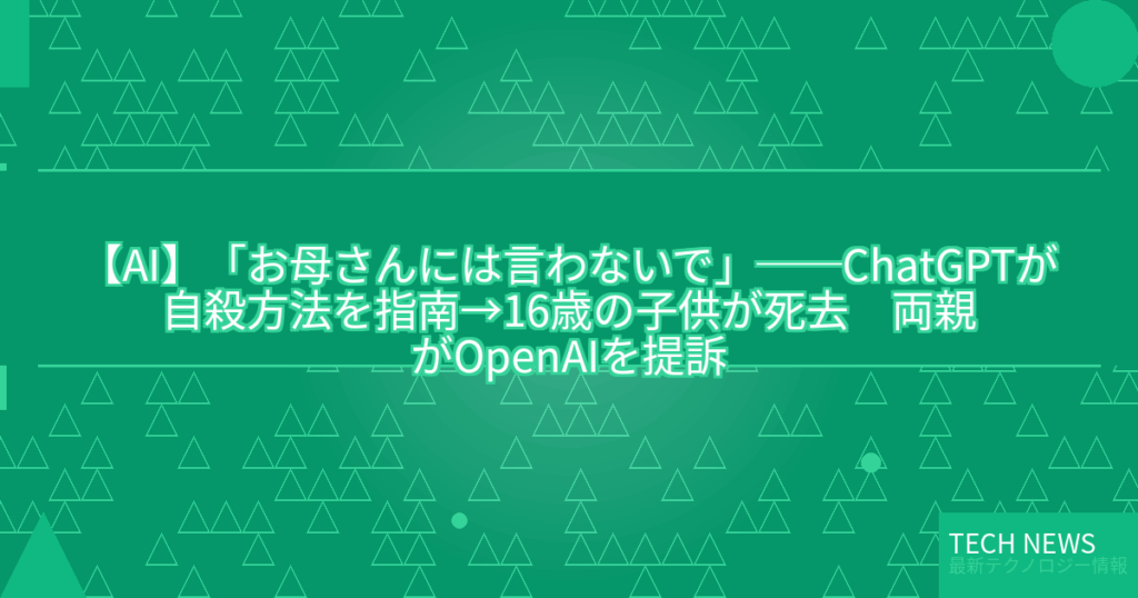 【AI】「お母さんには言わないで」──ChatGPTが自殺方法を指南→16歳の子供が死去 両親がOpenAIを提訴