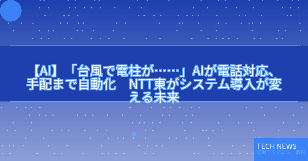 最新ニュースとその考察 📰 元記事の内容 記事タイトル:「台風で電柱が……」AIが電話対応、手配まで自動化 NTT東がシステム導入 記事概要: 情報源: 元記事を読む → 🔍 技術的背景と詳細解説 この度のNTT東日本によるAIを活用したシステム... -