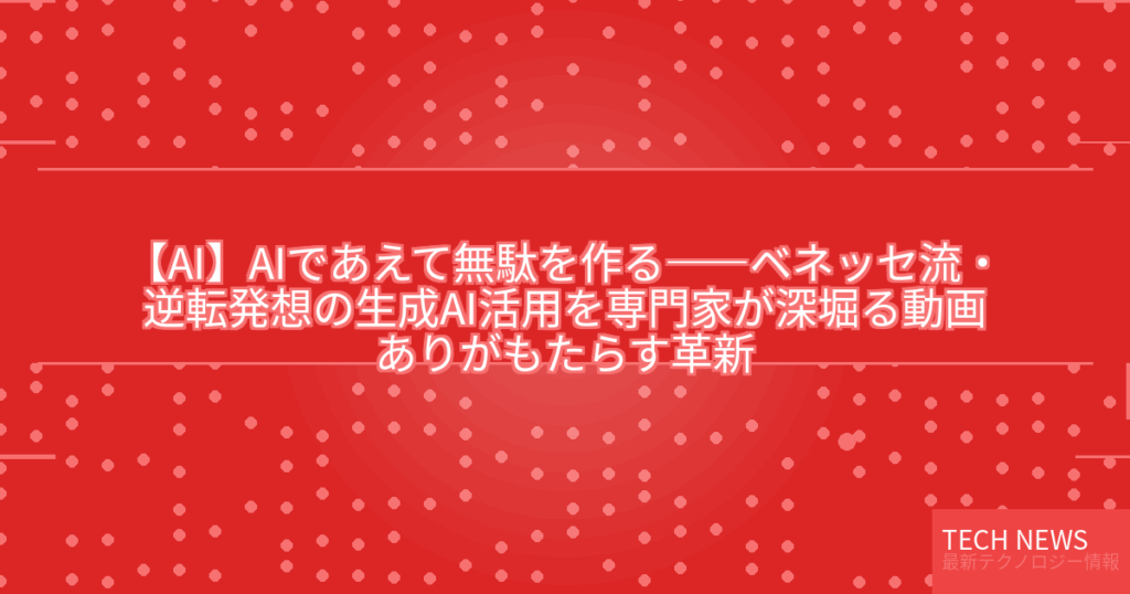 最新ニュースとその考察 📰 元記事の内容 記事タイトル:AIであえて無駄を作る――ベネッセ流・逆転発想の生成AI活用を専門家が深堀る【動画あり】 記事概要: 情報源: 元記事を読む → 🔍 技術的背景と詳細解説 本記事で取り上げられているの... -