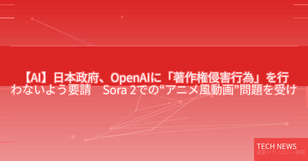 OpenAIの動画生成AI「Sora 2」で生成された、日本のアニメ作品に酷似した動画がSNS上に相次いで投稿されている問題を受け、政府がOpenAIに対して著作権侵害行為を行わないよう要請していたことが分かった。 -