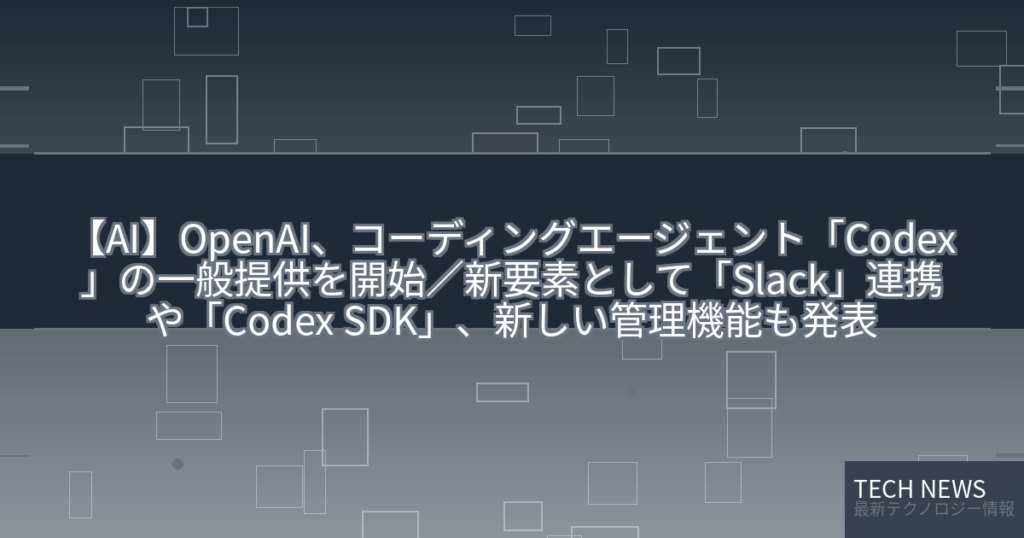 【AI】OpenAI、コーディングエージェント「Codex」の一般提供を開始/新要素として「Slack」連携や「Codex SDK」、新しい管理機能も発表