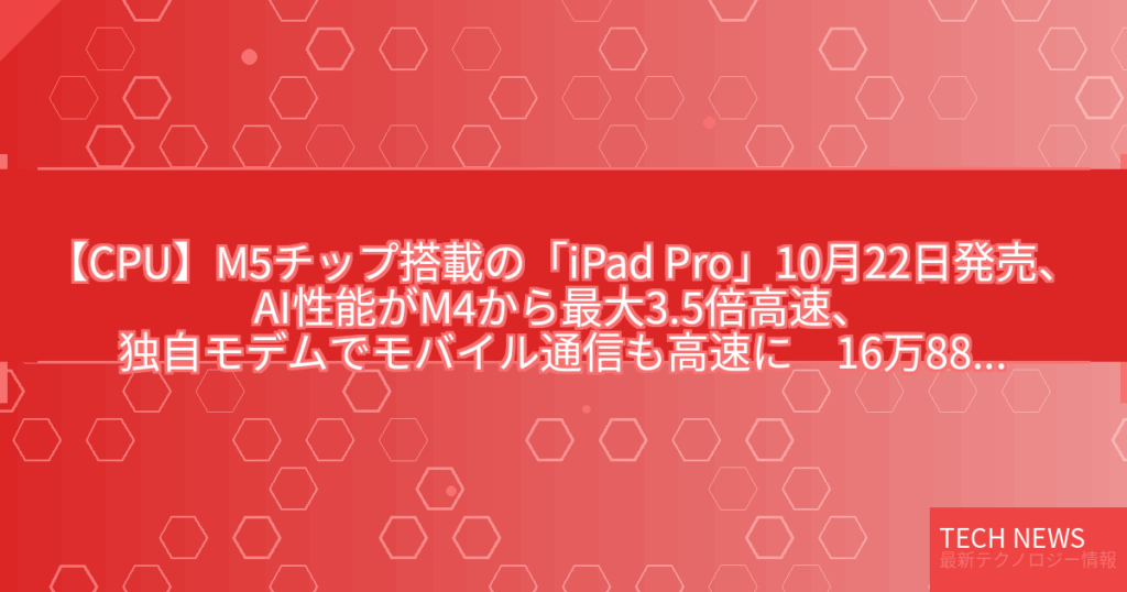 【CPU】M5チップ搭載の「iPad Pro」10月22日発売、AI性能がM4から最大3.5倍高速、独自モデムでモバイル通信も高速に 16万8800円から
