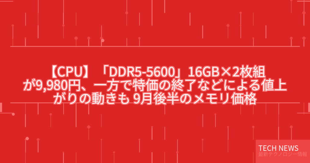 【CPU】「DDR5-5600」16GB×2枚組が9,980円、一方で特価の終了などによる値上がりの動きも 9月後半のメモリ価格
